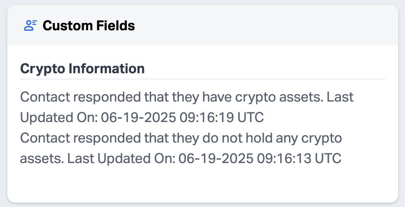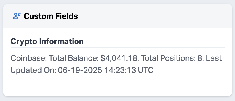 Upon successful connection, the contact's custom field in Wealthbox are automatically updated with the crypto exchange account data.