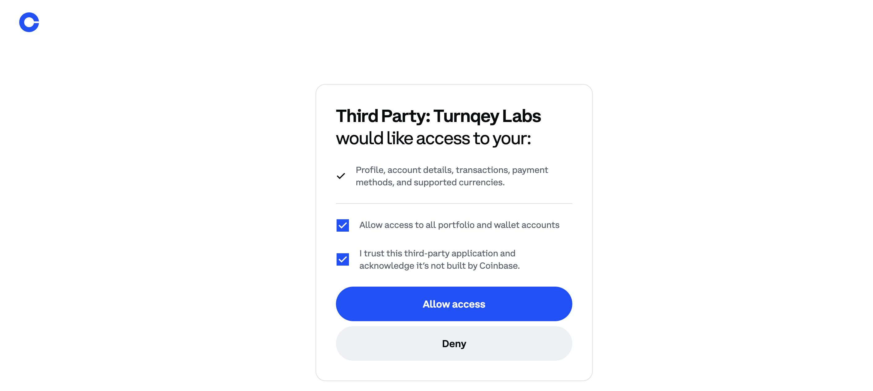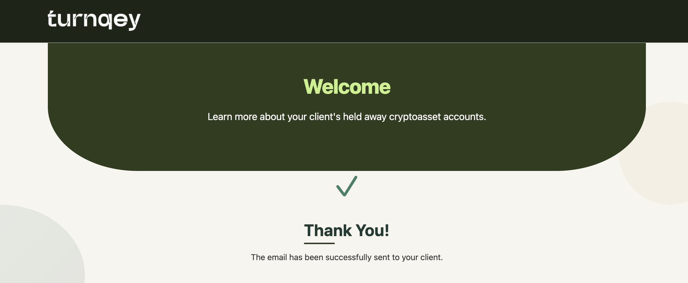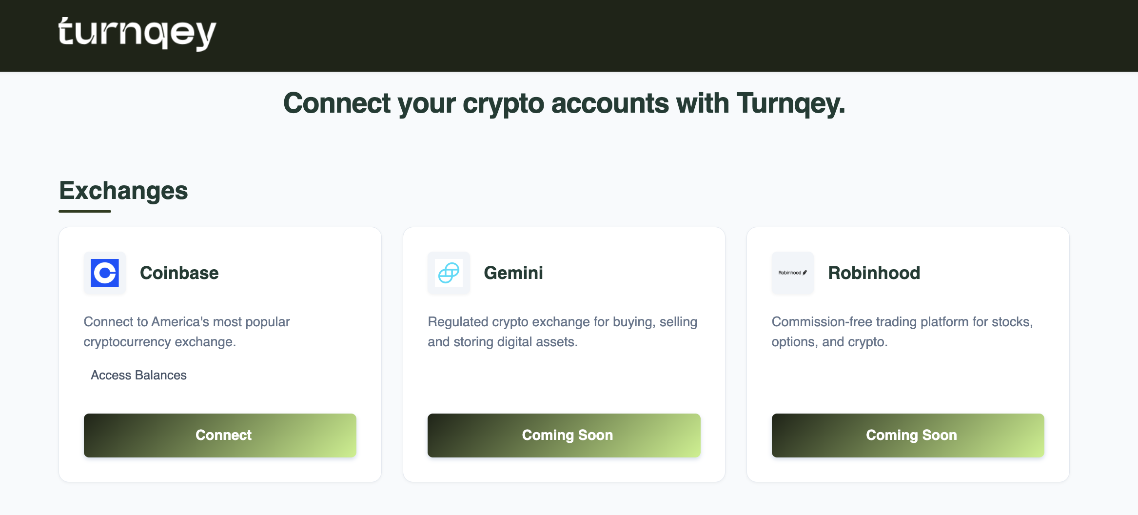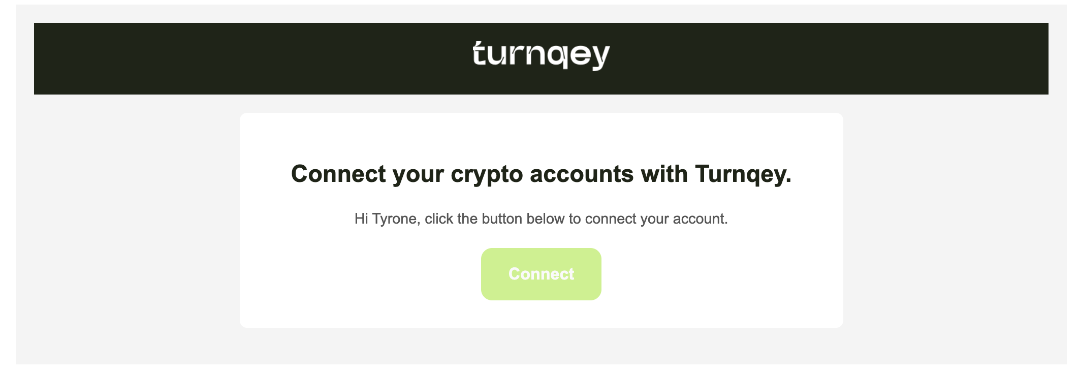 âConnectâ button in the email redirects the client to Turnqeyâs exchange connection page, where they select Coinbase and complete the OAuth flow.