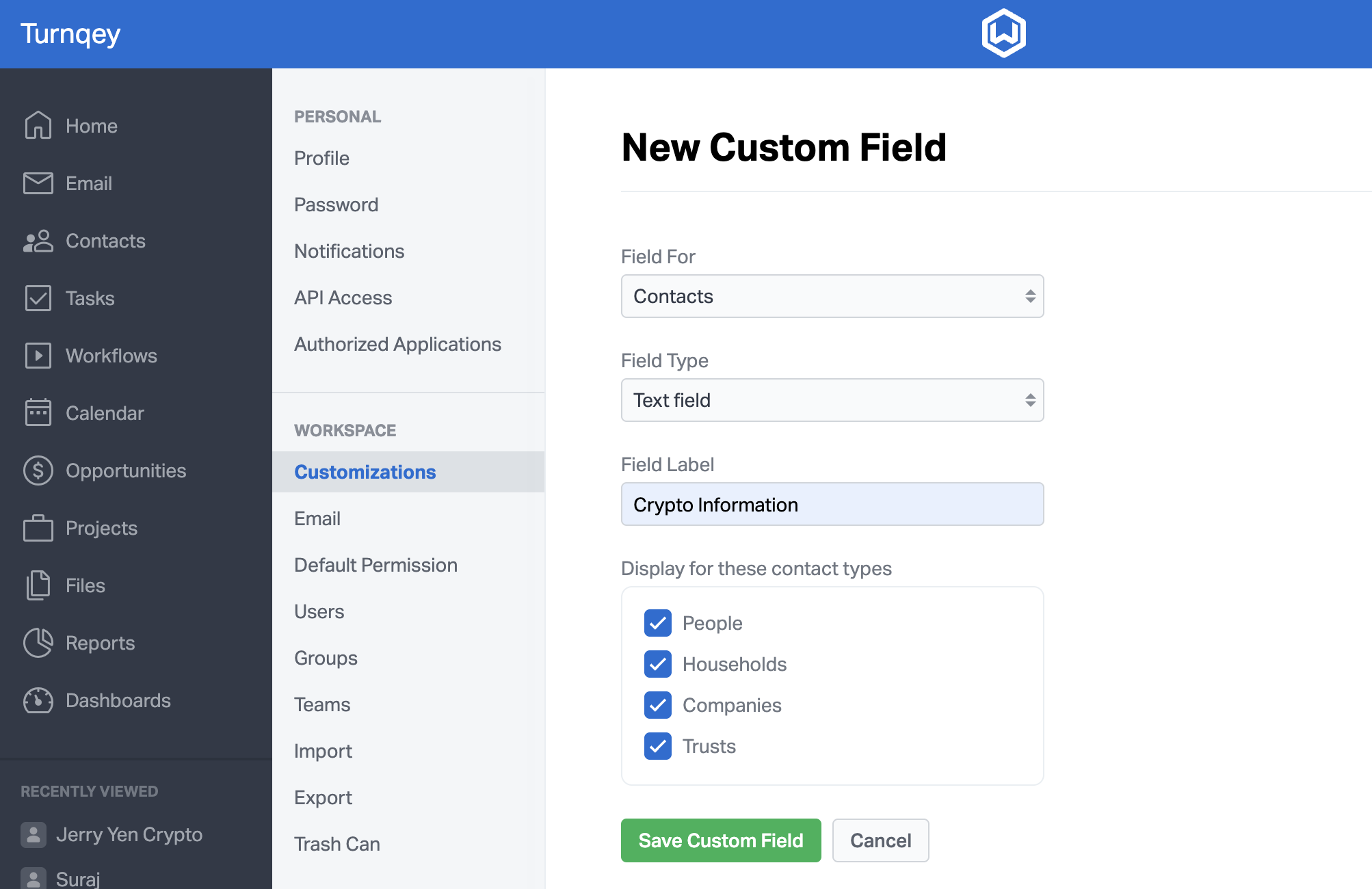 2. Custom field creation: In the Wealthbox portal, create a custom field with the exact name